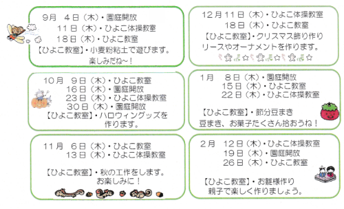 ひよこ教室、 園庭開放では自由に遊ぶ中、 子どもたちを通してお母様同士も交流が持てる良い機会です。ぜひ、遊びに来てくださいね。 10月4日の運動会もご参加お待ちしております。