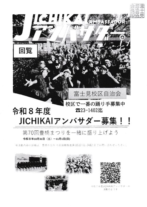 JICHIKAIアンバサダー募集!(豊橋まつり) 2026年3月配布のニュース 2026.03.31 JICHIKAIアンバサダー2025活動の様子作成した動画を友だち、家族、世界中の人たちと共有活動内容詳細は豊橋市役所 市民協働推進課 0532-51-2482 までお問合せください。