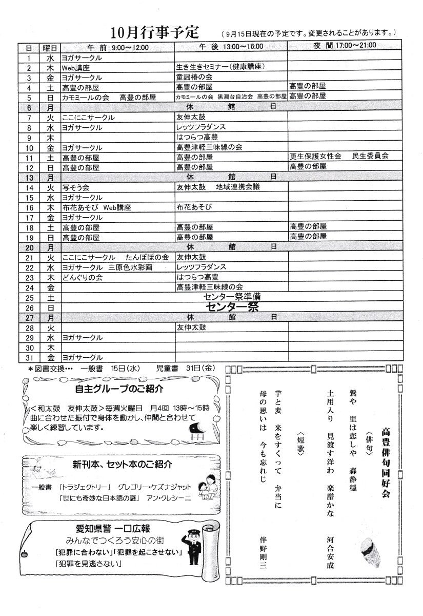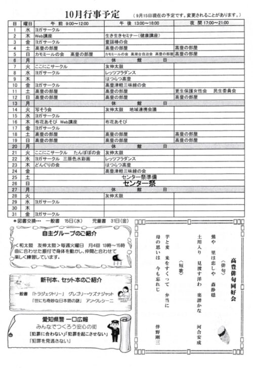 6月から悩まされていた 「酷暑」 も、 さすがに秋分の日を過ぎ、 夜の時間が長くなるに従い朝晩の空気の気配から夏の終わりを感じられるようになりました。 早く日中も過ごしやすくなるように願うばかりです。 さて、いよいよ10月はセンターまつり。今年は子供たちが参加するゲームも増え、 大人も一緒に楽しめるものもあります。 キッチンカーが来園し、 参加賞もたくさん用意します。 お楽しみに!