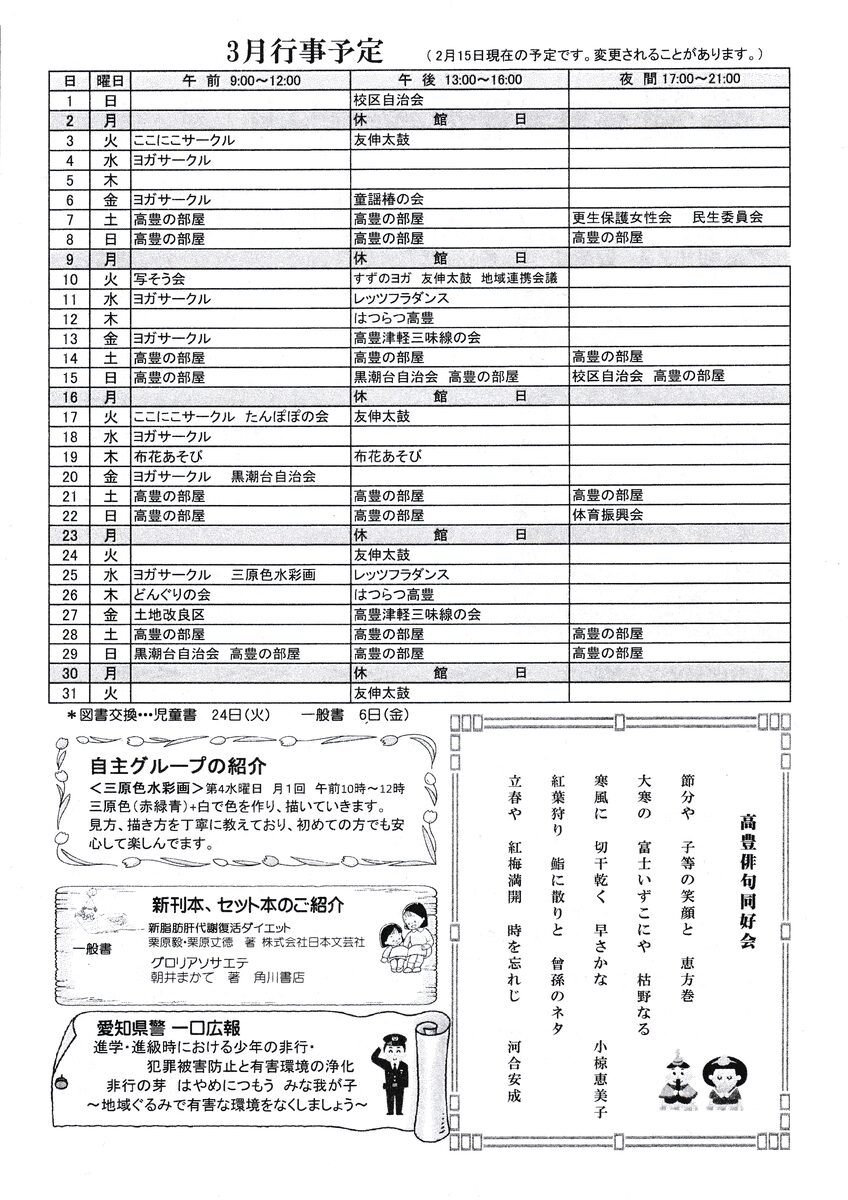 年も改まって2か月が過ぎ、あちらこちらで桜の花芽が膨らみ、そして咲き誇っていくこの時期は新しい出会いと別れが繰り返され、何度経験していても心ワクワクしつつ心がシクシクする落ち着かない日々が続きます。それぞれ進学・就職・転勤など新しい道に進んでいくことになりますが、みなさんの身近な方たちはいかがですか。当センターでも夜の主事が1名退職予定ですので、年度が改まると新しいスタッフでみなさんをお迎えします。そして、講座も新たにスタートします。高豊生き生きセミナーは4月に入り次第募集を開始します。興味のある講座のみの参加も大丈夫です。下記に貼付した予定表を参考にしてお申込みください。