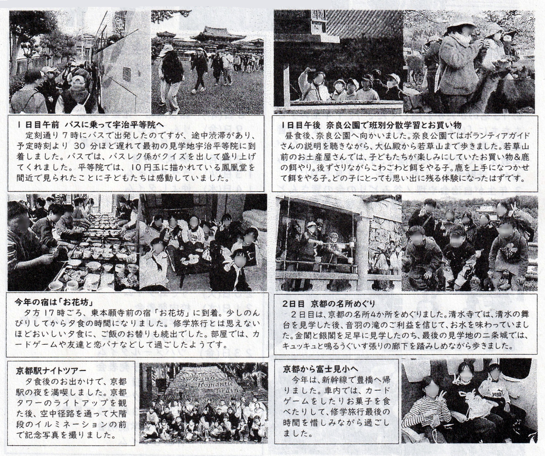 11月25日、26日の二日間、6年生が奈良・京都へ修学旅行に行ってきました。今年は、奈良・京都の紅葉真っ盛りの時期に当たり、どこへ行っても赤や黄色に色づいた古都の景色を楽しむことができました。